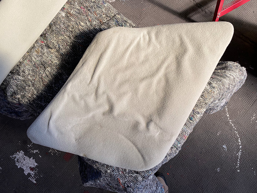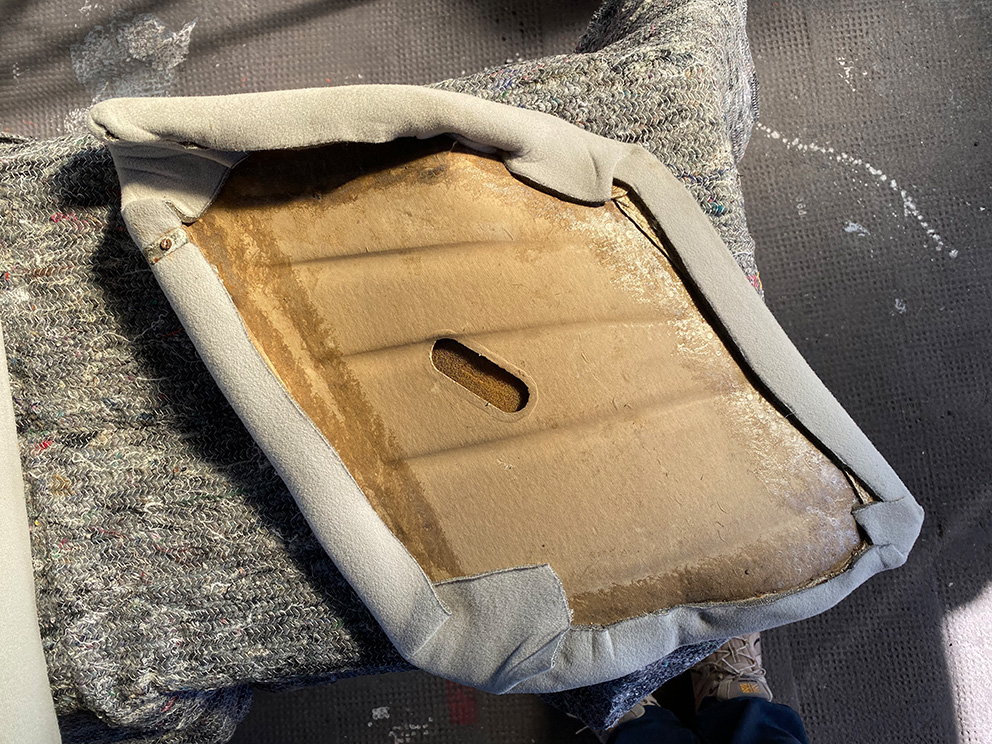 das Dach ist gerade draußen und bekommt eine neue Dichtung (beim Abnehmen ergaben sich natürlich leider auch Überraschungen und nötige Arbeiten am Dachrahmen). Offenbar haben auch die C-Säulen-Kissen immer mal wieder schön Wasser gezogen - jetzt sind sie über den Winter mal richtig schön durchgetrocknet. Und die originale Trägerpappe ist leider stark verzogen (konkave Wölbung zum Innenraum).