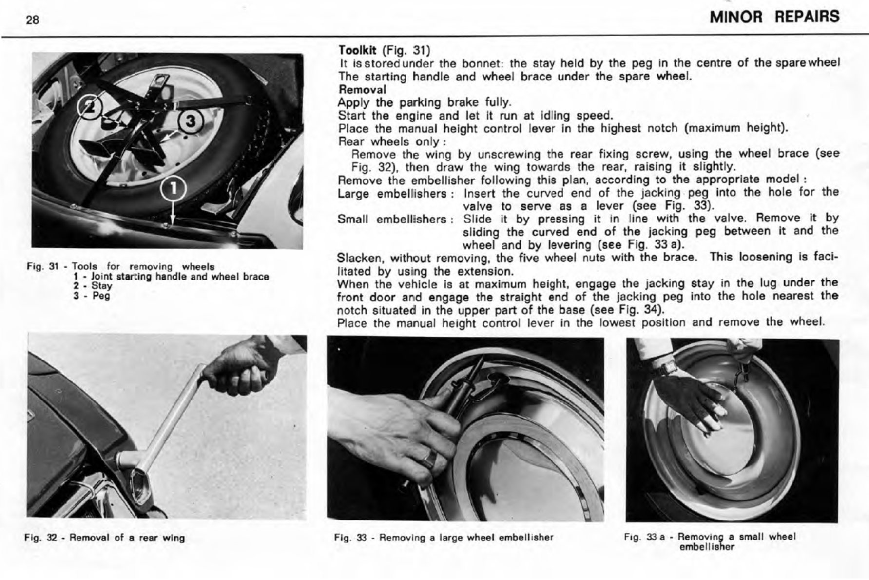 Hier unten einige Bilder (aus zwei englische Bedienungsanleitungen) welche verdeutlichen wie genial multi-funktionell die vier Teile des Radwechselwerkzeuges sind.