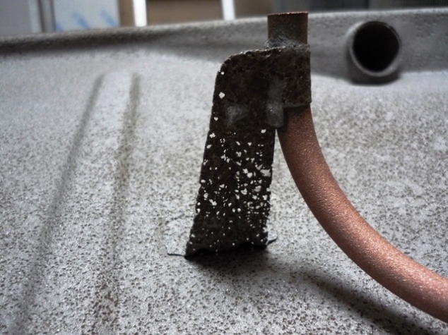 Bild 6 zeigt noch deutlicher die Schlacht zwischen Ferrit und H²O, hier fand der Angriff aber auch von 2 Seiten statt !! Das Rohr ist nur die Führung des Ansaugschlauches, welcher bei mir sehr schwer rauszuziehen ging. Um später beim reinschieben nicht auf halber Höhe steckenzubleiben und dadurch immer nur den halben Tank leerfahren könnte, s. Bild 7.