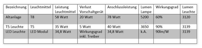 Ich hab mal Leuchtstoffröhren mit LED verglichen. Im Allgemeinen scheint der Wirkungsgrad ähnlich zu sein (je nach Hersteller).